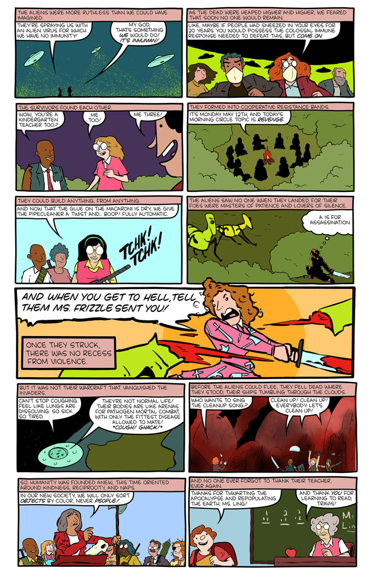 No matter how many she killed, Ms. Frizzle knew she could never heap their bodies high enough to blot out the memory, blazing with pane, of the fate of little Carlos. An 11x17 print of this beloved comic.